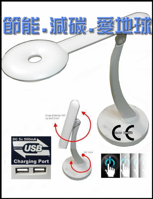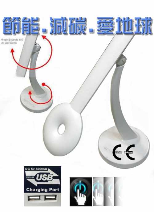 適用於居家任何空間 •辦公/讀書皆適宜 •可上下擺頭180度.左右擺頭270度 •內建2個USB Port 可使用於MP3/手機充電 • 消耗功率6瓦.照度相當於460流明 • AC 110v 輸入 • 台灣設計.大陸生產